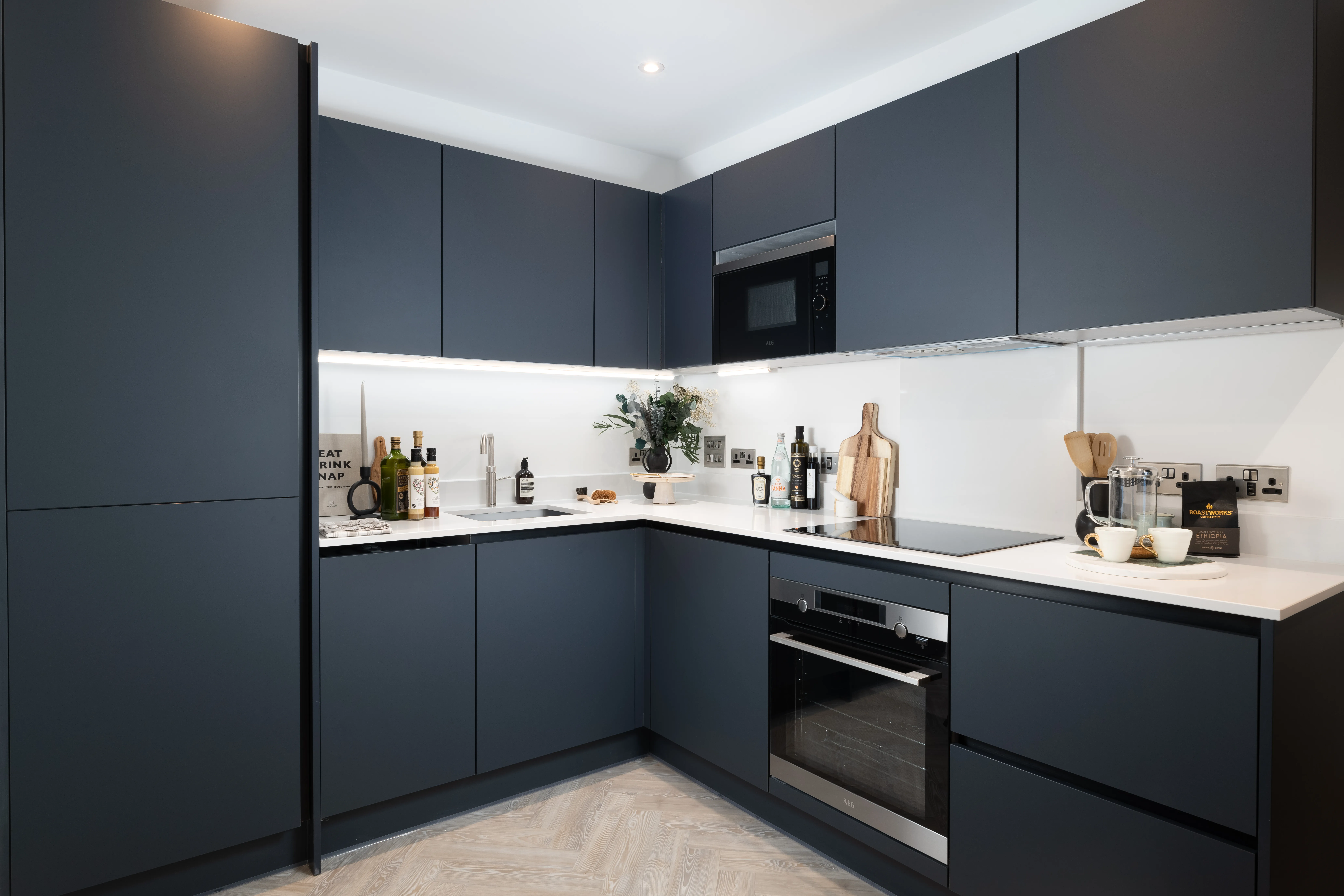 The kitchen/living/dining area has been finished with an inviting open-plan layout leading to a private balcony, complete with premium herringbone detail flooring, while the kitchen features matt finish handless units with soft close doors and drawers, a selection of fully integrated appliances and Quooker stainless steel tap.