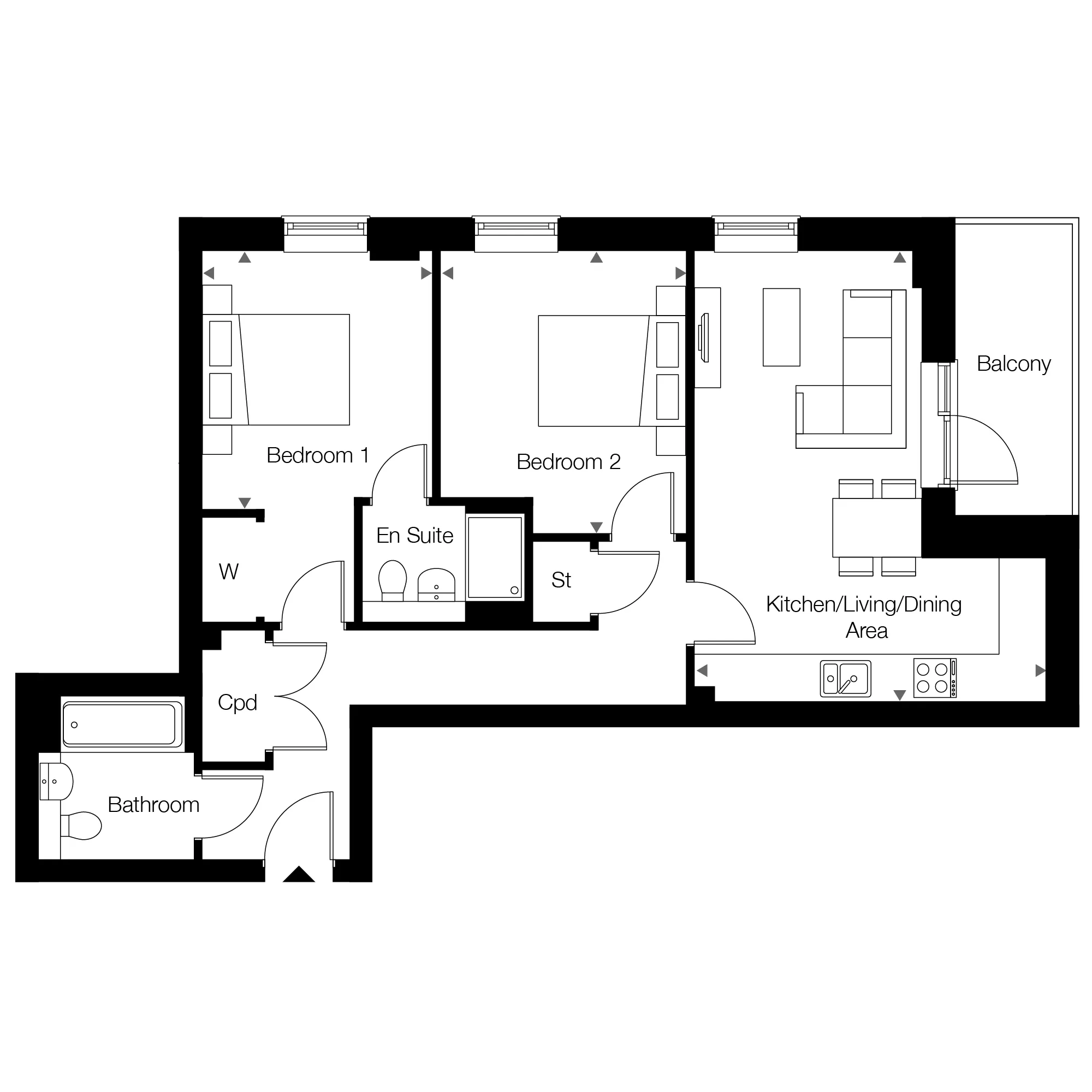 A large, south-facing private balcony gives views over the pretty landscaped gardens and tonnes of sunlight throughout the day. The space provides a wonderful opportunity to dress the balcony to suit your own style, with seating or outdoor dining, stylish planters and plenty of green vegetation and blooms.